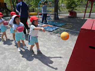 「ボールを投げる」という動きがなかなかわからず、みんなまっすぐに立っているだけでしたが、足をしっかり広げて両手でボールを持ち、顔の横から思いきって投げる、という動作を教えてもらうと少しずつうまくボールを投げれるようになってきました!